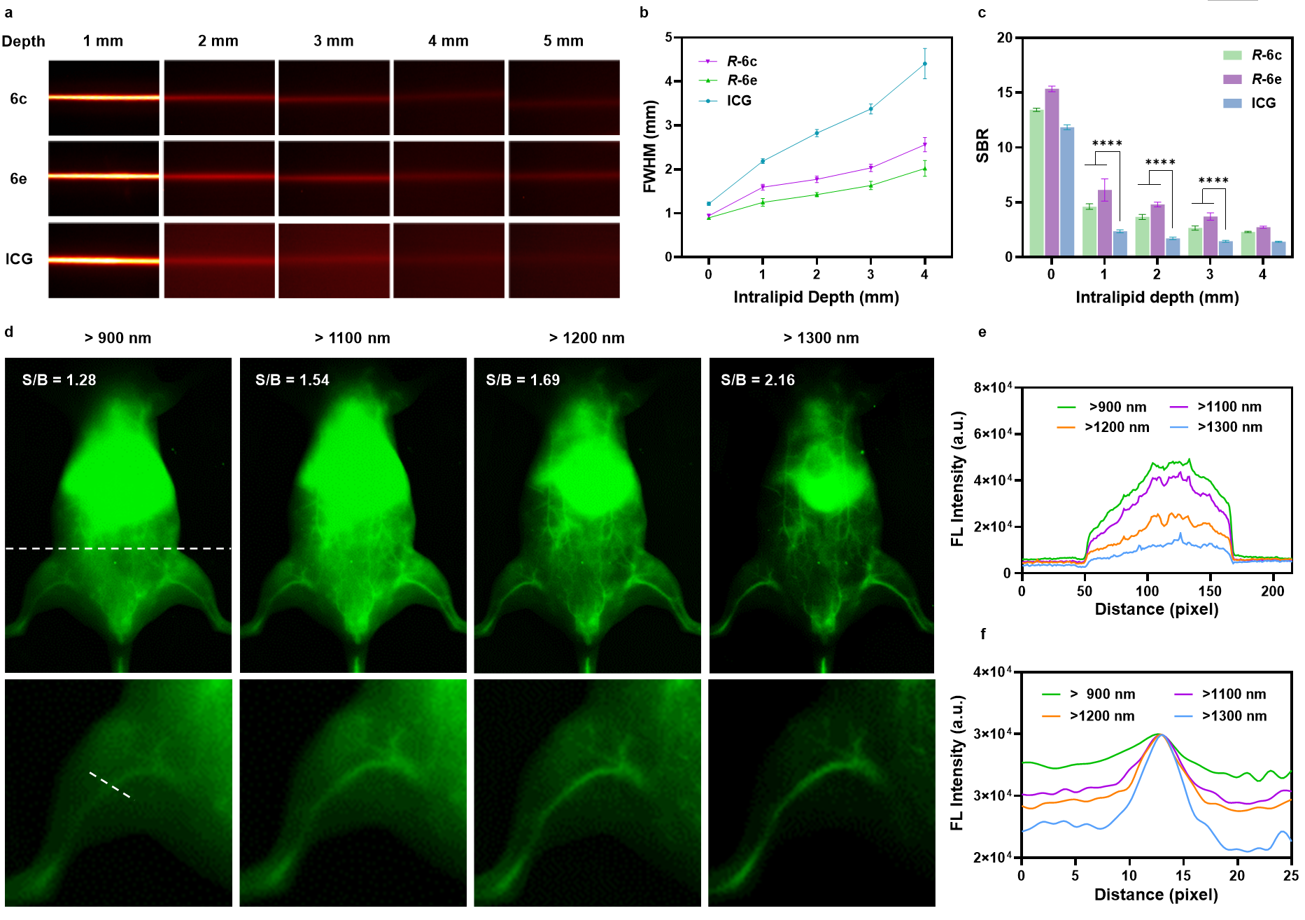 此外,该研究还系统评估了硼手性BODIPY在近红外二区成像中的性能。与临床常用的ICG相比,BODIPY探针在组织模拟环境中表现出更强的穿透深度、更高的成像分辨率与更优的信噪比。体内实验显示,6c@BSA能实现清晰的全身及局部血管成像,尤其在大于一千三百纳米窗口中背景极低。生物分布与组织学分析进一步证明了其良好的生物相容性。整体而言,这类手性 BODIPY探针兼具了优异光学性能与生物选择性,为靶向近红外成像提供了新的可能性。