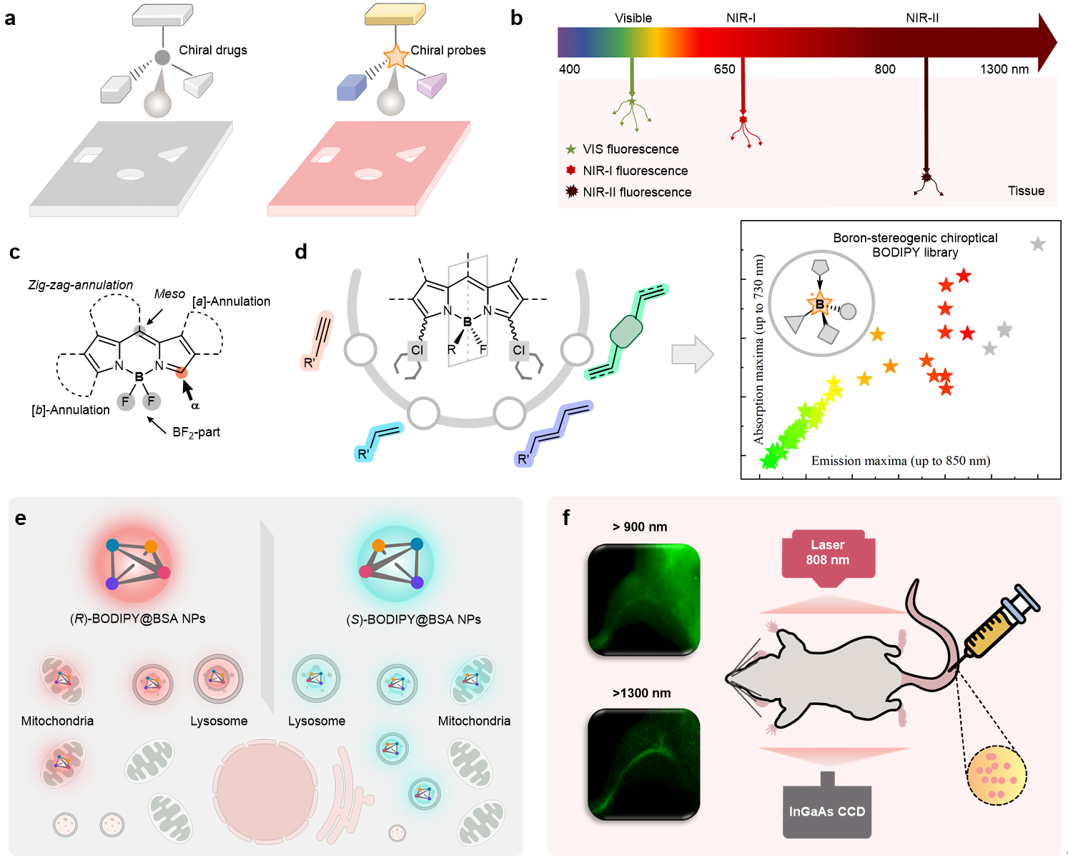 近红外区间的光在生物组织中的散射小、吸收低、背景弱,是实现深层、高对比度成像的关键波段。在诸多NIR发色团体系中,BODIPY以其高度稳定、结构可修饰、量子产率高等优势脱颖而出,并在光诊疗、光子学材料、活体成像等领域展现出独特地位。然而,传统BODIPY结构多集中在可见光范围,难以满足深层组织成像的需求。如何在保持其光学优势的同时,赋予其硼中心手性,并实现其体系化的构建与应用,一直以来缺乏有效的手段。