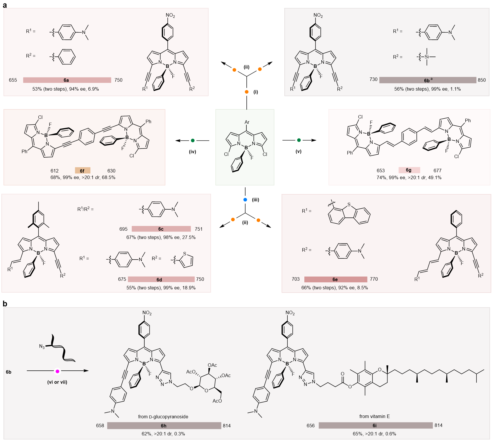 为进一步红移所得硼手性BODIPY的吸收与发射波长,并展示该体系的结构扩展潜力,作者对α-氯取代的BODIPY进行了多种立体专一的功能化转化。首先,具有不同meso芳基的二氯 BODIPY可顺利经历串联炔基化和烯基化反应,高效构筑3,5位置双取代的手性 BODIPY产物6a-6e,具有优良的对映选择性和显著红移的近红外发射(750-850 nm)。值得一提的是,这些在两个α位引入不同的炔基、烯基或二烯基的结构在此前均难以获得,该方法实现了它们的快速合成。此外,作者成功制备了由1,4-双炔基苯或双烯基苯桥连的BODIPY二聚体6f和6g,具有 99% ee和超过20:1的优异非对映选择性。这类独特的二聚结构在荧光成像中具有较高应用潜力。进一步地,作者利用含三甲基硅基的6b与含有生物活性分子结构单元(如D-葡萄糖苷和维生素E)的叠氮化物进行铜催化的点击反应,顺利获得手性BODIPY三氮唑衍生物6h和6i,产率良好且具有优异的非对映选择性。这一结果表明,经该方法构筑的硼手性BODIPY不仅具备结构可调控,也有望在生物成像与荧光标记等领域发挥作用。