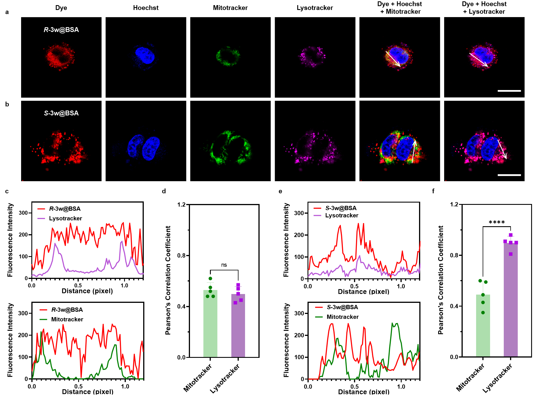 为探究硼手性中心对成像行为的影响,作者进一步开展了细胞器共定位实验。利用MitoTracker Green与LysoTracker Red对两个对映体进行分析,结果显示S-3w@BSA对溶酶体具有显著偏向性,其与LysoTracker Red的PCC达到0.896,明显高于其线粒体共定位程度(PCC = 0.492)。相比之下,R-3w@BSA 在溶酶体与线粒体中的共定位程度相近,说明手性可显著影响染料对细胞器的亲和性。