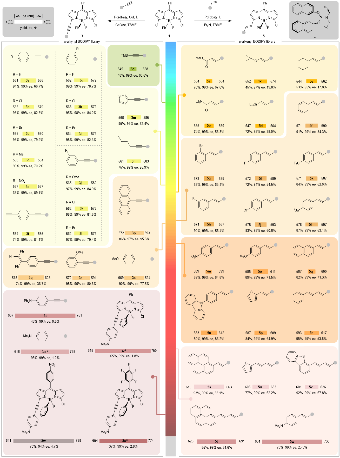 在此基础上,研究团队进一步开发了高效合成α-烯基硼手性BODIPY的方法。将反应体系使用的碱更换为三乙胺后,前手性底物1a可与多类烯烃经历高效的不对称Heck偶联,得到高ee的α-烯基BODIPY(5a–5w)。无论是含酯、酰胺、醚、硅烷等官能团的烯烃,还是芳基烯烃、稠环烯烃及多种共轭二烯体系,都表现出优异兼容性。芳基烯烃及强给电子取代的烯烃(如N,N-二甲基苯乙烯)的发射波长均显著红移,其中5w的发射峰达到730 nm。通过引入杂芳环以及稠环结构(如卡唑、萘基、噻吩等),发射波长可进一步延长,实现近红外手性BODIPY染料构建。